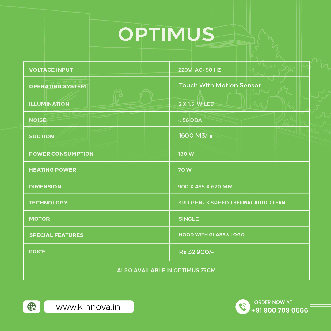 • Upgrade your kitchen in Kolkata with the Optimus 90, the best chimney for city homes. With touch control and motion sensor technology, it delivers powerful performance and modern style, keeping your kitchen fresh and smoke-free. Perfect for the vibrant cooking of Kolkata!