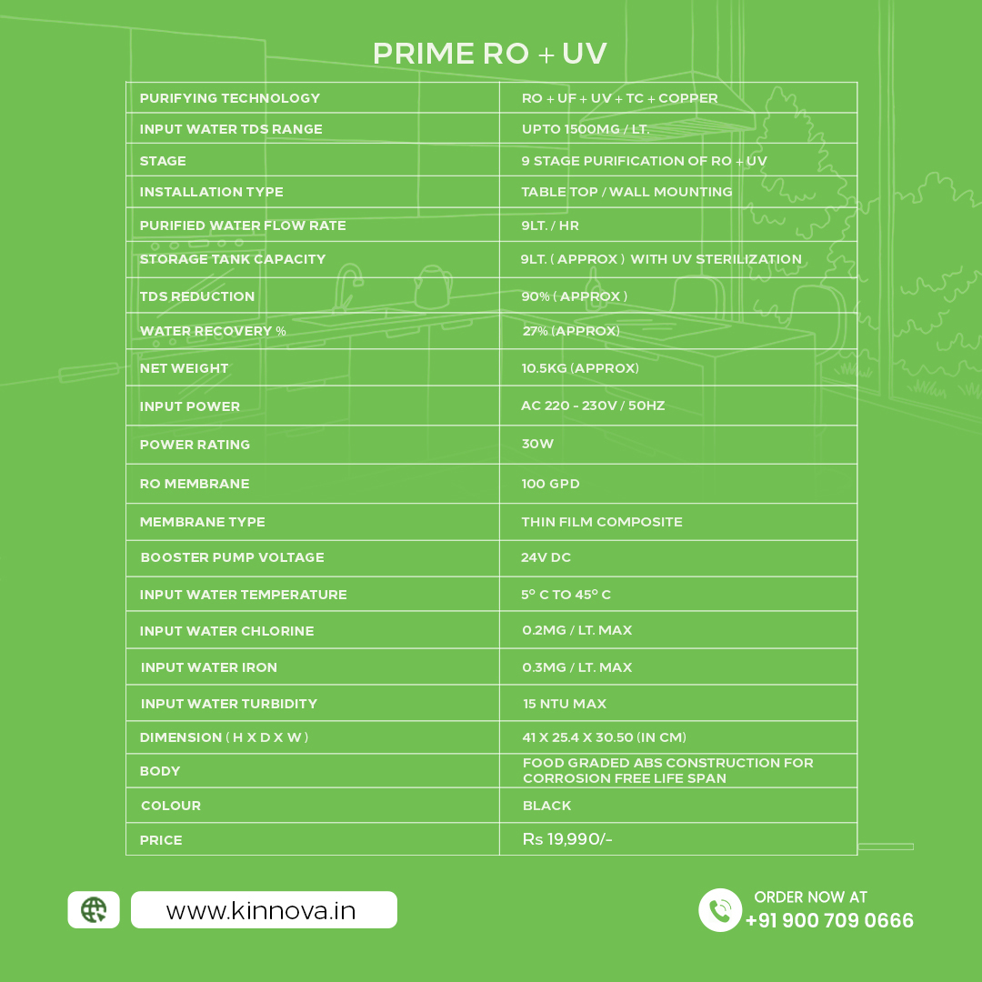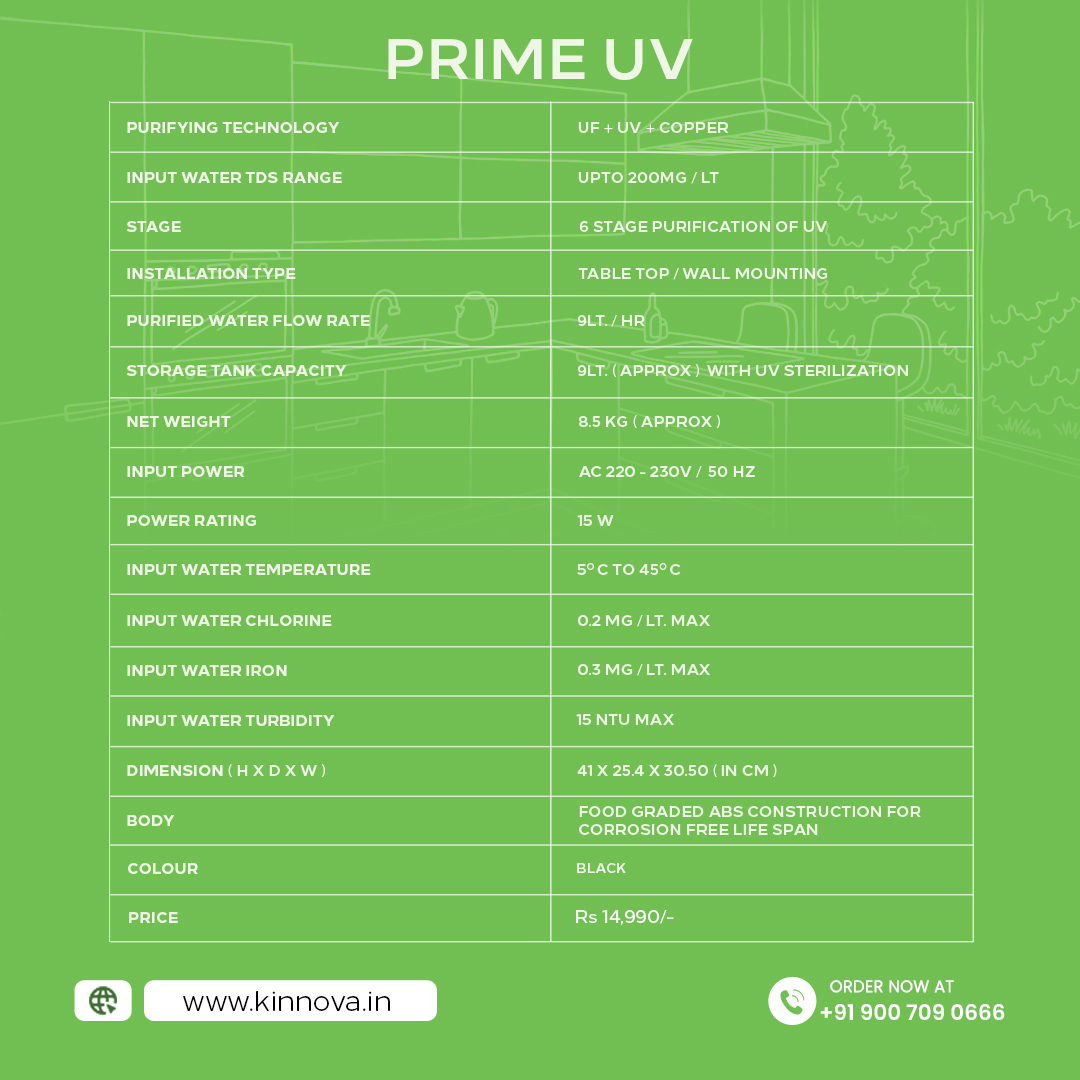• Introducing Prime UV, the best water purifier for home use. With cutting-edge UV and UF purification technologies, it ensures that every drop of water is safe and healthy for your family. Enjoy crisp, clean water effortlessly and elevate your home’s hydration game!